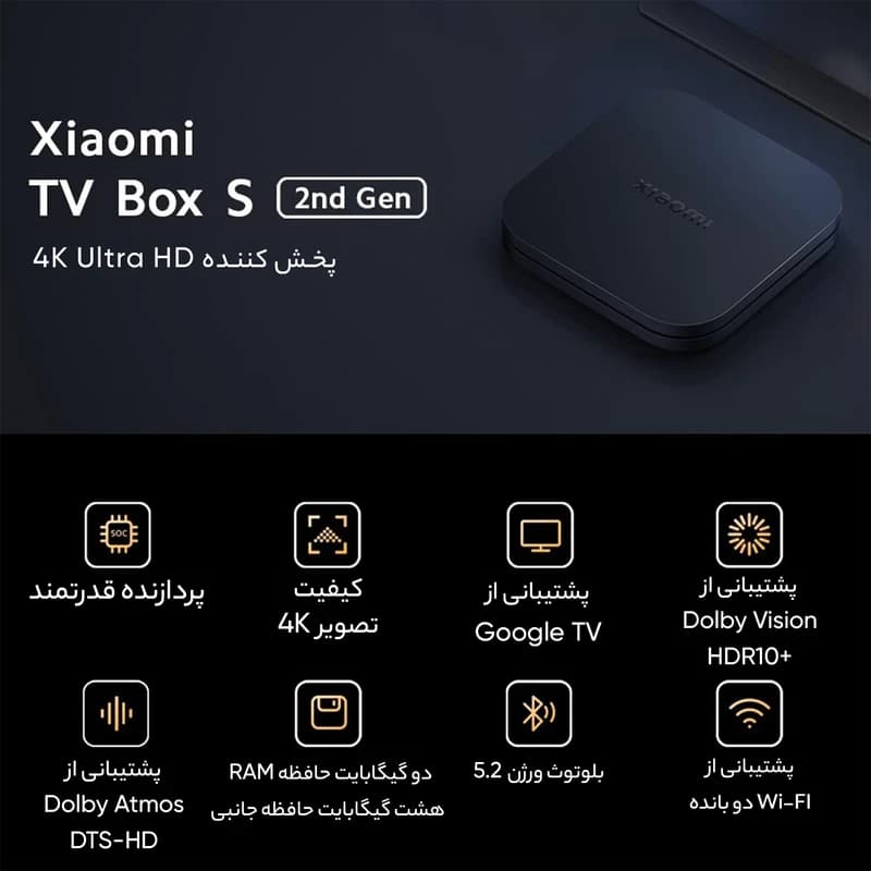 رزولوشن ۴K – پشتیبانی از شبکه های تلویزیونی ۴K – صدای دالبی – DTS / فرمت های صوتی: MP۳,APE,Flac / فرمت های تصویری : RM,MOV,VOB,AVI,MKV,TS,Mp۴,۳D / رزولوشن تصویر: (۴K (۳۸۴۰ x ۲۱۶۰ / پردازنده : Cortex-A۵۳ Quad-core ۶۴bit / پردازنده گرافیکی : Mali-۴۵۰ / حافظه: ۸GB eMMC / سیستم عامل: Android ۱۱