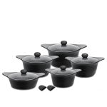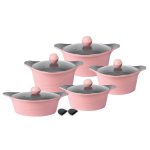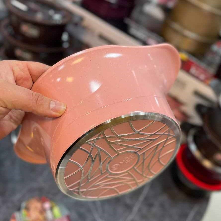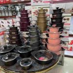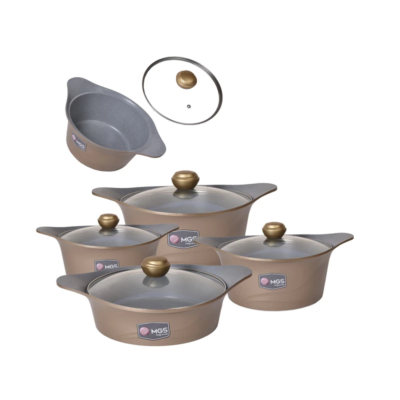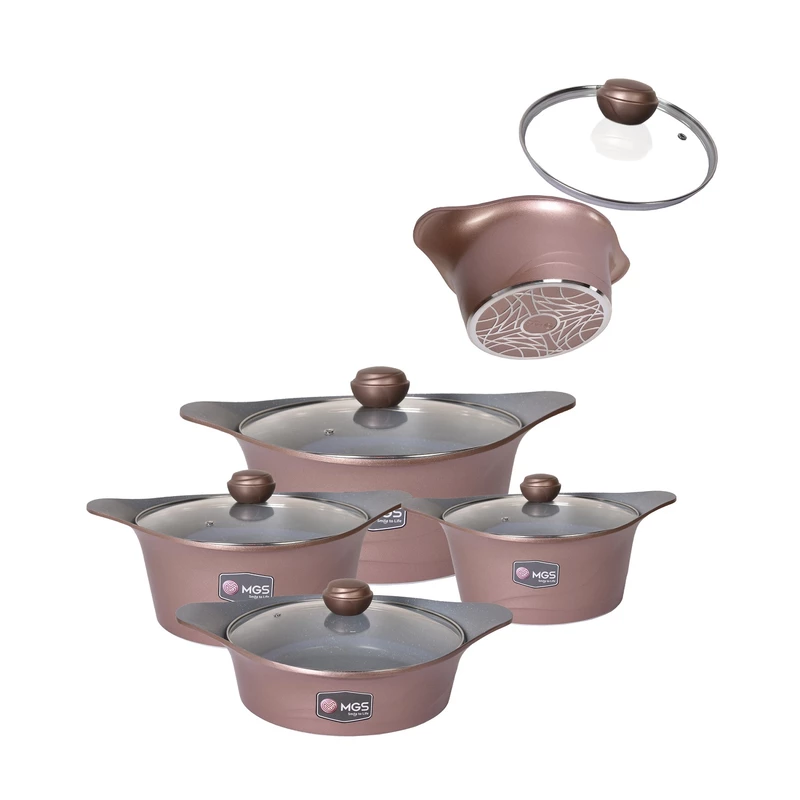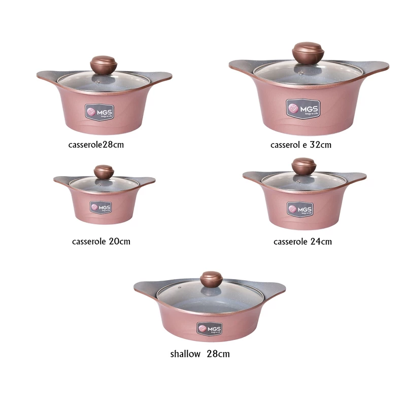 ساخت برند mgs كارخانه ايران تحت نظارت مستقيم تكنسين ها خارجي _درپوش داراي سوپاپ براي خروج بخار _شامل: قابلمه سايز ها ۳۲ سانتي متر _ ۲۸ سانتي متر _ ۲۴سانتي متر_ ۲۰ سانتي متر _ تابه ۲۸سانتي متر ديواره بلند . تكنولوزي پوشش داخل آن اختصاصي برند ام جي اس با گريد A مي باشد.