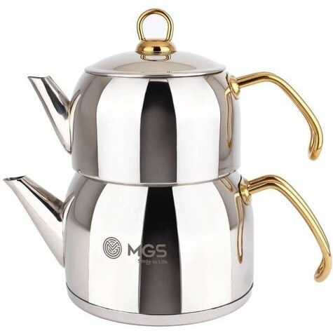 کتری و قوری لوله دار ام جی اس با قوری استیل براق طلایی برند MGS کد 41014